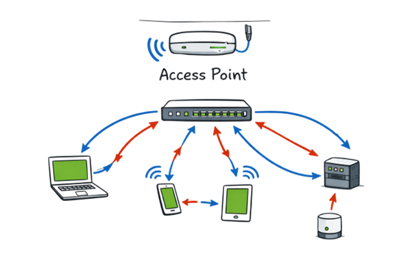 Access Point: Allows wireless devices to connect to a wired network.