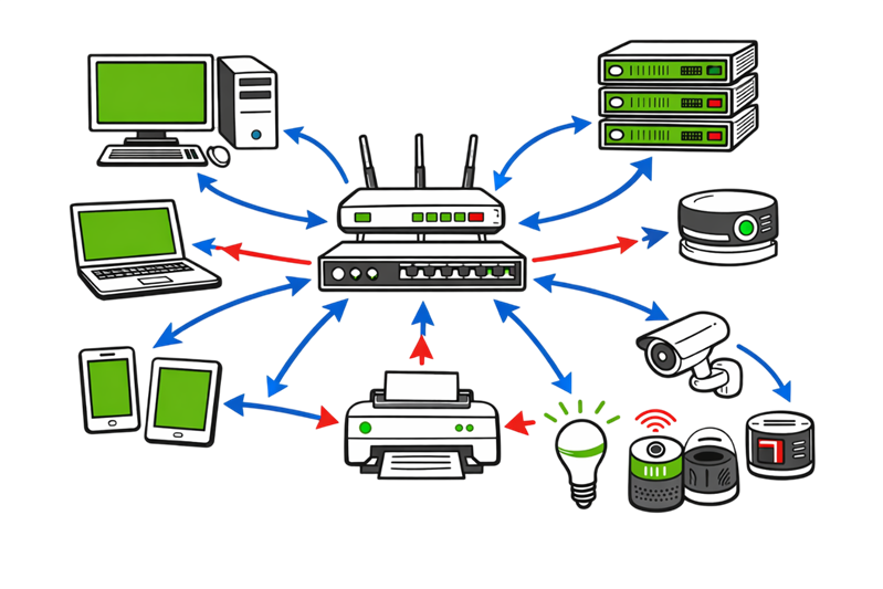 Imagine you have two computers connected through a cable, and both can exchange files — that’s a small network. When you add more devices, such as a router and internet connection, you get a larger network like the one in your home or office.