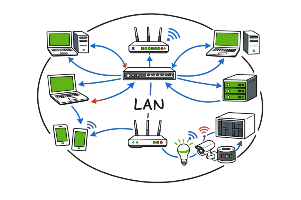Covers a small area such as a home, school, or office. All connected devices can communicate easily.