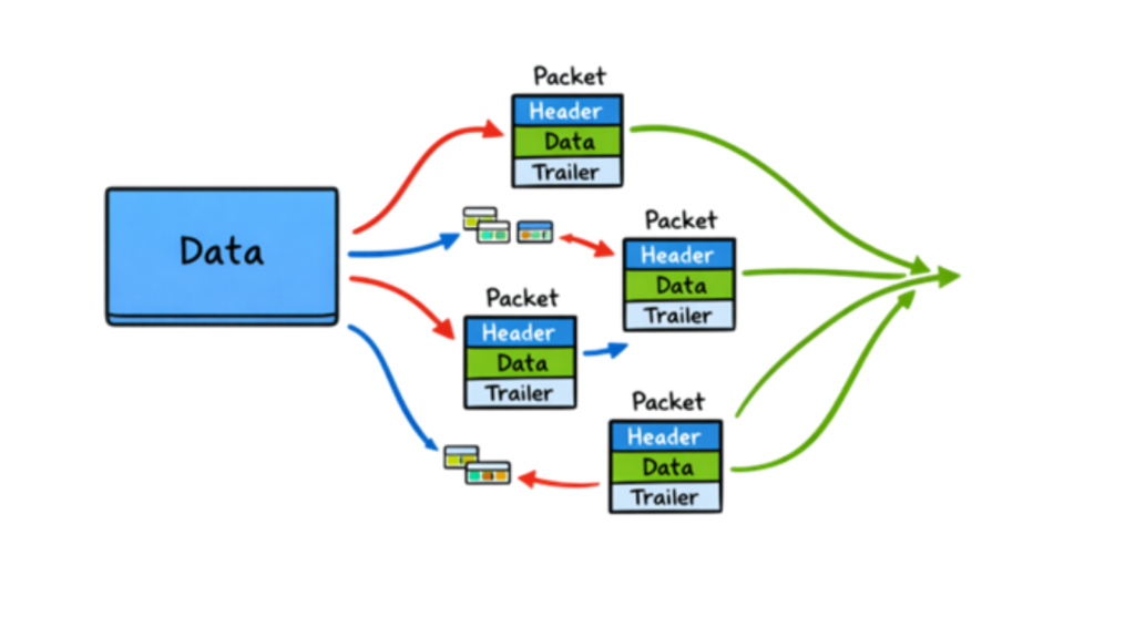 Network data is broken into small pieces called packets. Each packet has a destination address and travels independently across the network.