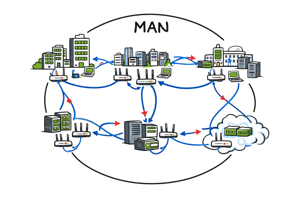 Larger than LAN but smaller than WAN, often used to connect offices across a city.
