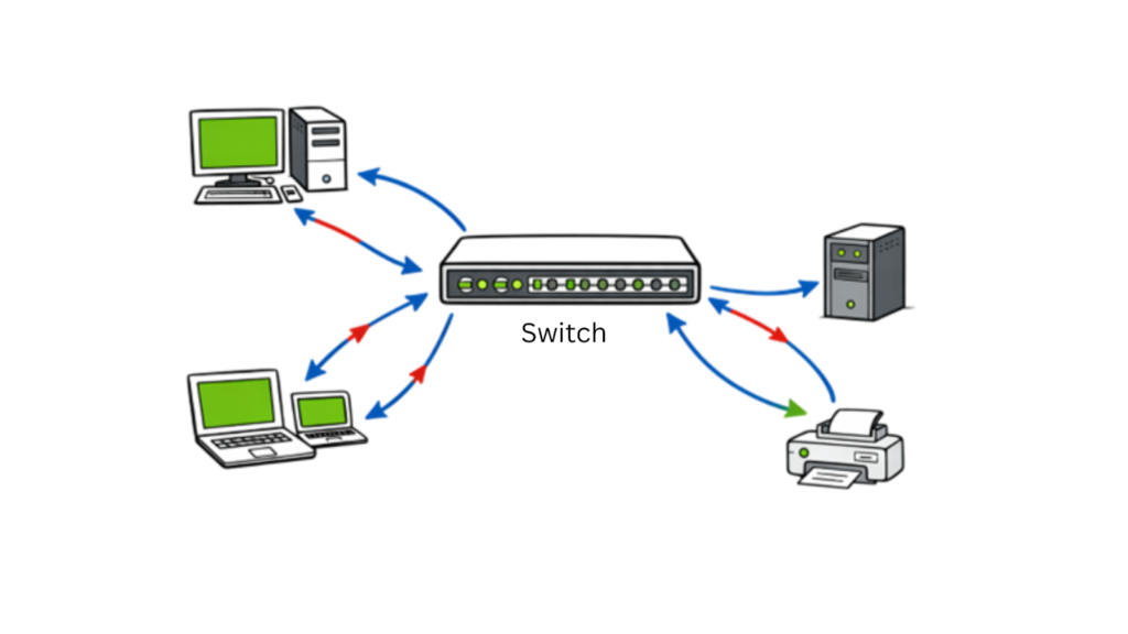 Switch: Connects multiple devices inside a local network and forwards data to the correct destination.