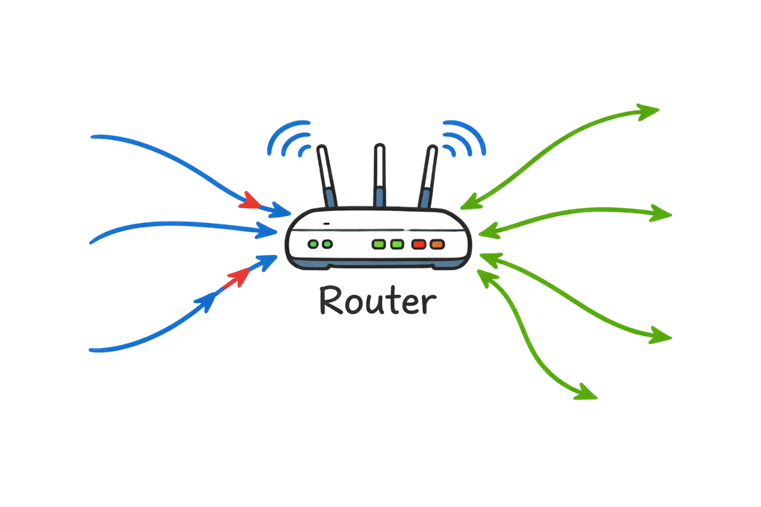 Router: Connects different networks (for example, your home network to the Internet). It directs traffic like a post office sorting mail.