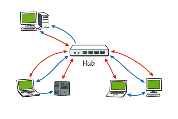 Hub: A simple device that sends data to all connected devices, not just the intended one (less secure than a switch).